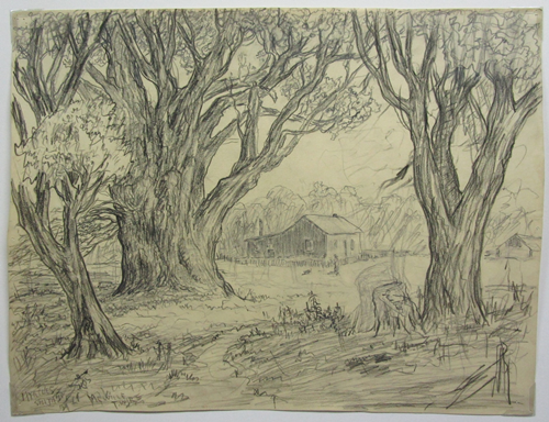 Drawing in black crayon or oil pencil on tan paper by Melville Wire, 1939.
