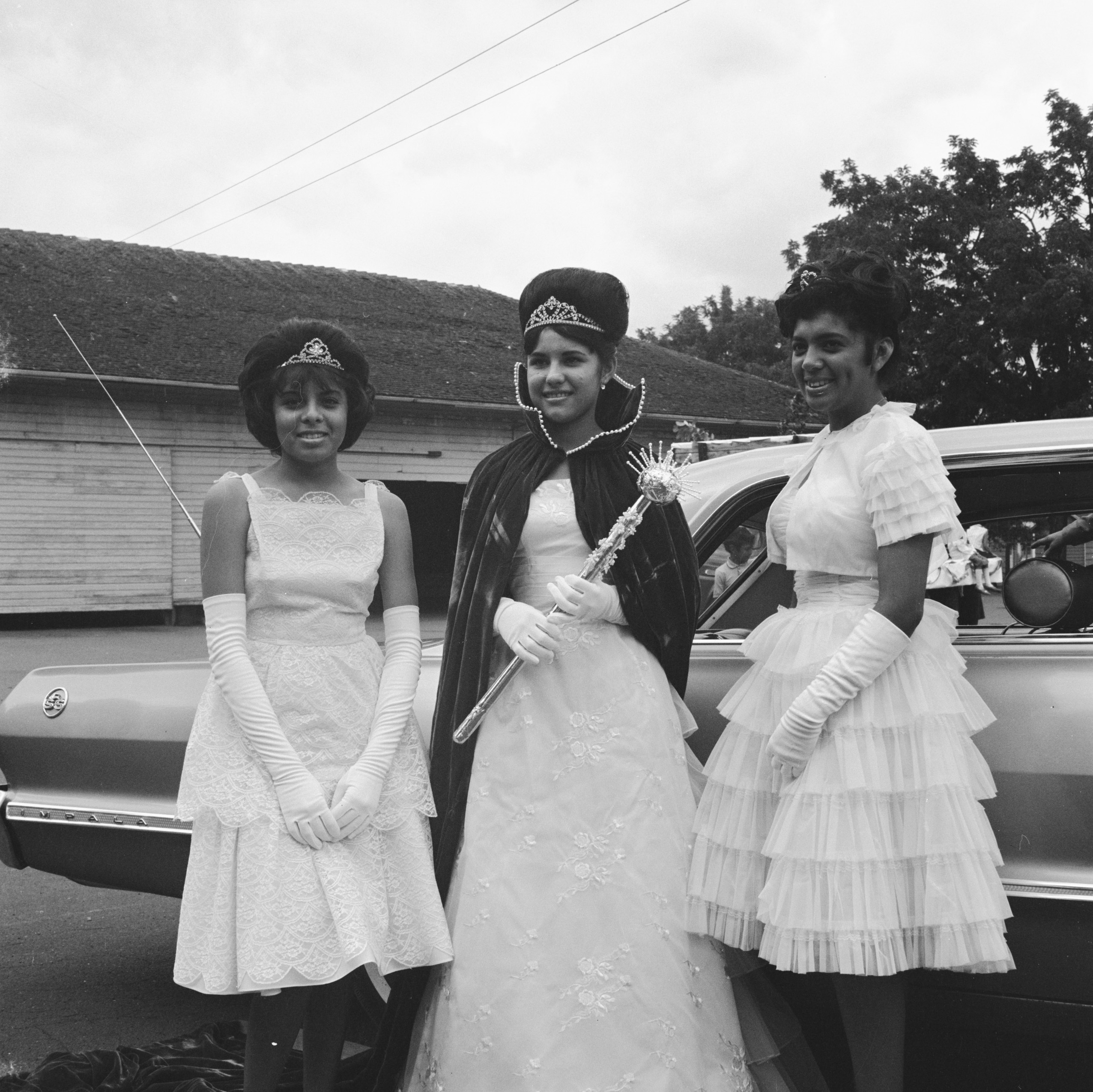 ![]()  Maggie Saldana, Elvira Carbajal, and Lydia Padilla, Fiesta Days court, Woodburn, 1966. Oregon Historical Society Research Library, OrgLot74_1025