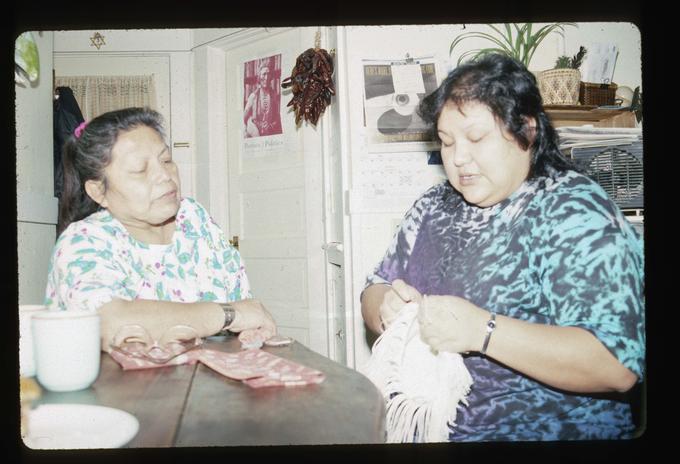 Elizabeth Woody apprentices with Master Artist Margaret Pennah to make a root digging bag, 1992.