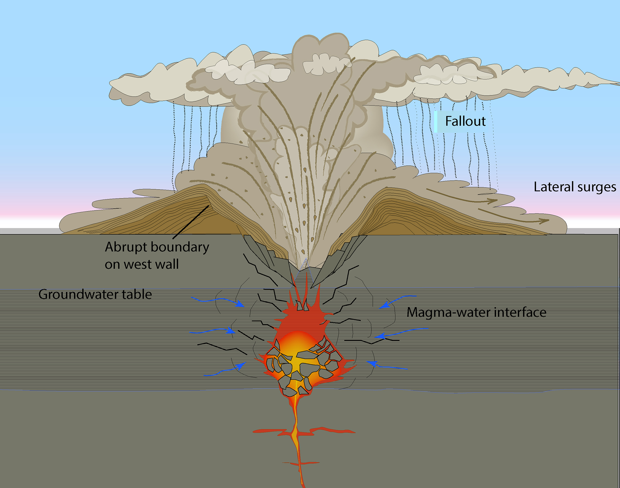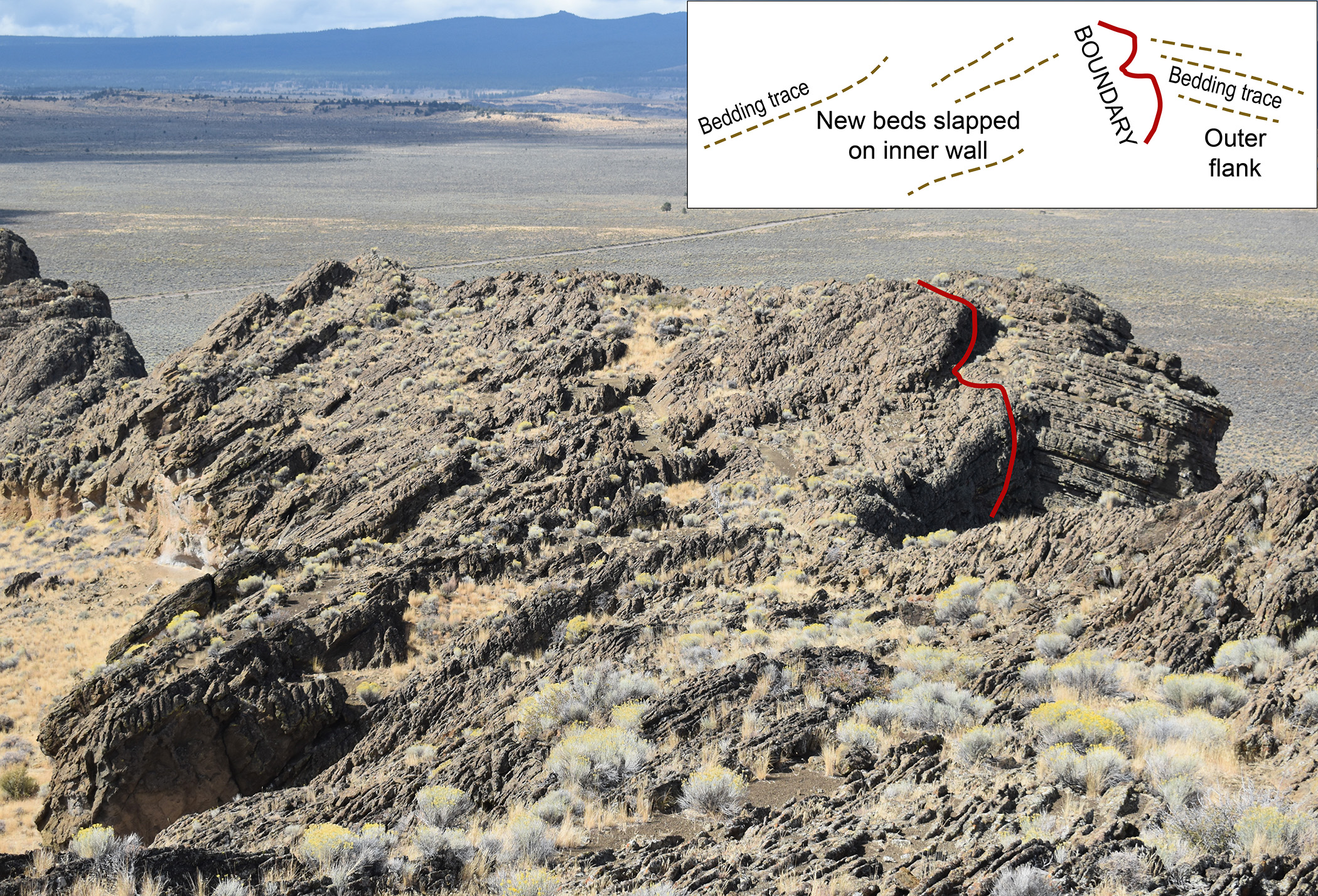 Photograph showing notable discordance between the bedding attitude of younger layers where plastered against sloughed wall of crater during eruptions